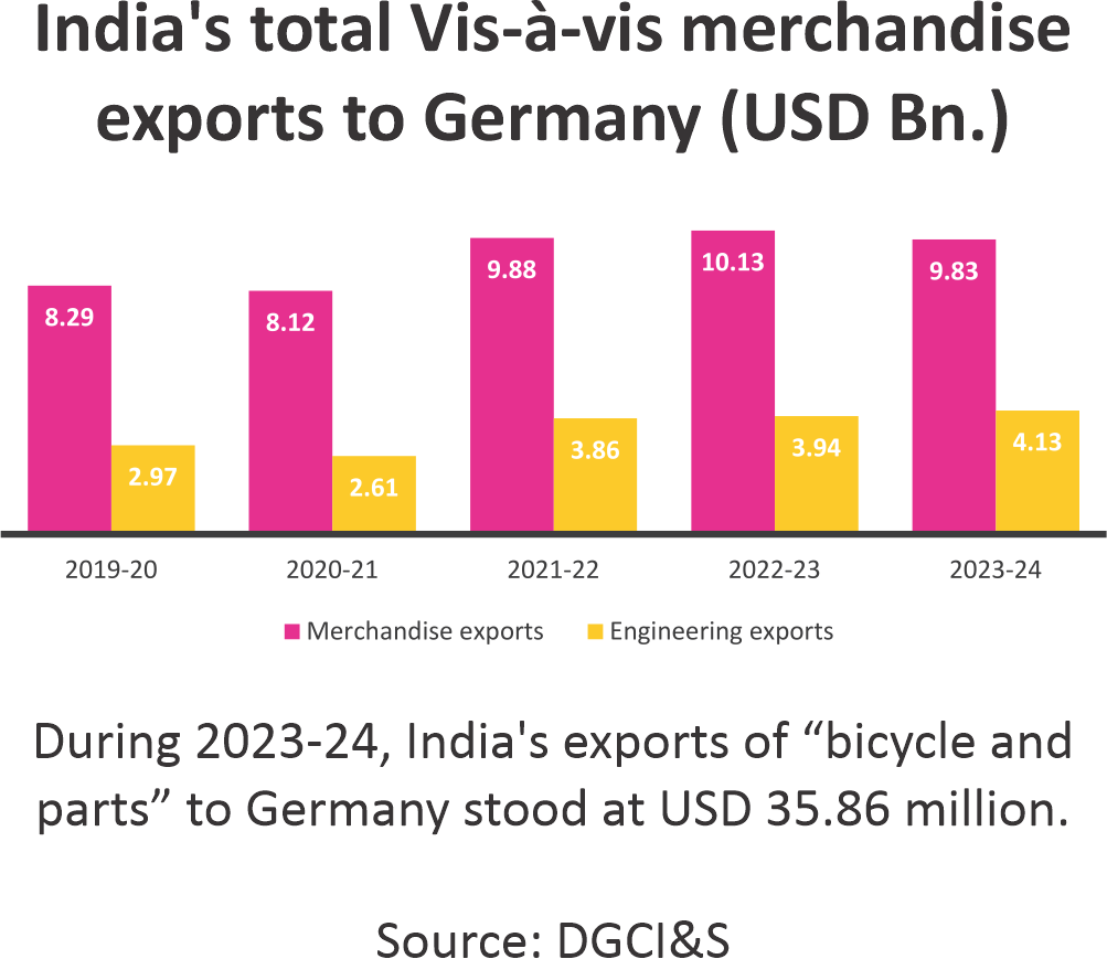 Germany is the fourth largest destination for India's engineering exports and the largest in European Union. Engineering exports to Germany was recorded at USD 3.24 billion in 2018-19 and then, after declining in the next two fiscals due to the pandemic, it continued its rise in the next fiscals. In FY 2023-24, engineering exports to Germany increased by 4.7% contrary to the decline in overall merchandise exports. Major engineering panels exported from Germany to India include electrical machinery, auto components, products of iron and steel, industrial machinery, medical and scientific instruments, auto tyres and tubes, injecting and moulding machinery, IC engines, etc.