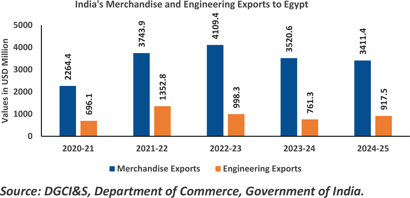Egypt has traditionally been one of India's most important trading partners in the African continent. The India-Egypt Bilateral Trade Agreement has been in operation since March 1978 and is based on the MFN clause. India's merchandise exports to Egypt grew by a Compounded Annual growth Rate (CAGR) of 10.8 percent during the last five completed fiscals. It went up to USD 4.1 billion in 2022-23 but then declined to 3.41 billion in 2023-24 due to economic challenges faced by Egypt and disruption in global trade routes, particularly those affecting the Suez Canal due to geo-political conflicts in the West Asian region. India's top exported items to Egypt are Meats, Organic chemicals, Machinery and mechanical appliances, Mineral fuels, Cotton, and Iron and Steel