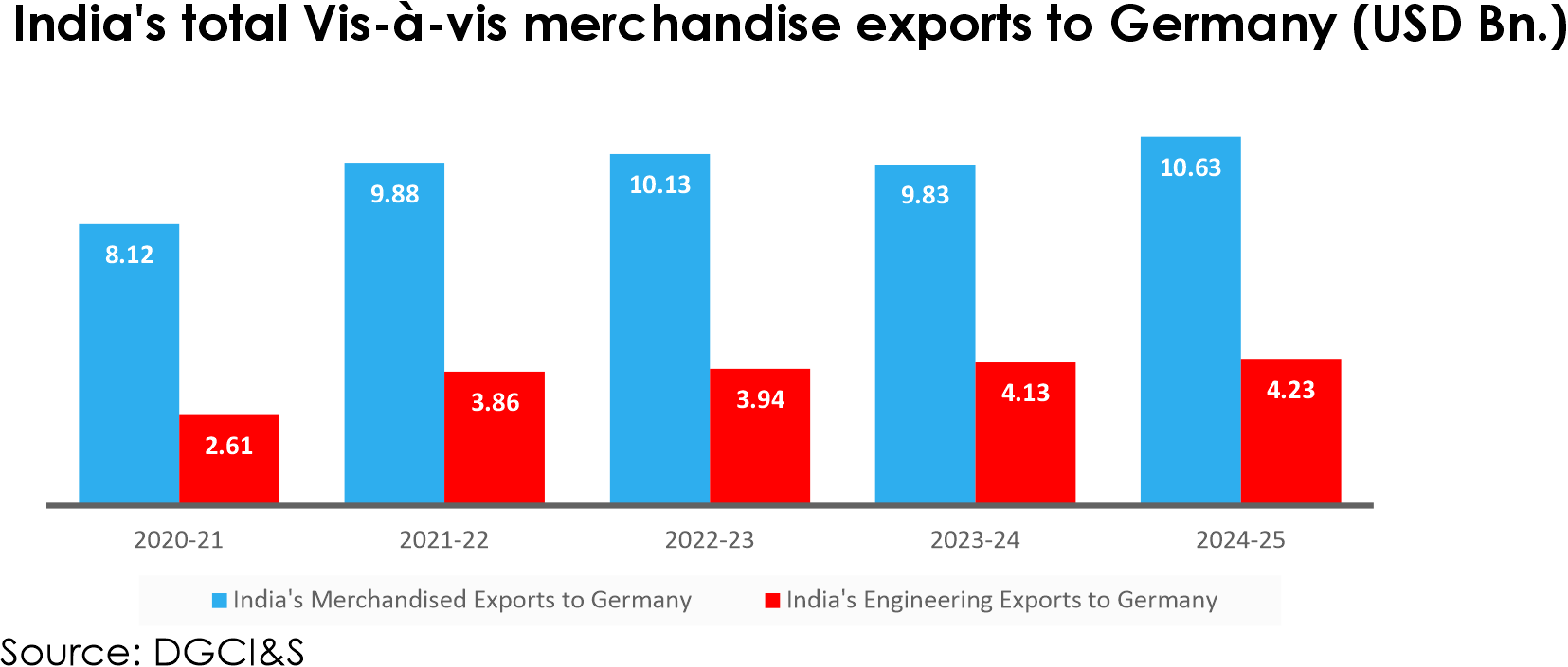 Germany is the fifth largest destination for India's engineering exports and the largest in European Union. Engineering exports to Germany was recorded at USD 3.24 billion in 2018-19 and then, after declining in the next two fiscals due to the pandemic, it continued its rise in the next fiscals. In FY 2024-25, engineering exports to Germany increased by 2.4% while India's overall merchandised exports to Germany increased by 8%. Major engineering panels exported from Germany to India include electrical machinery, products of iron and steel, auto components and parts, industrial machinery, medical and scientific instruments, auto tyres and tubes, IC engines, injecting and moulding machinery etc. in 2024-25, India's total exports of automobile and auto components to Germany stood at USD 1.37 billion.