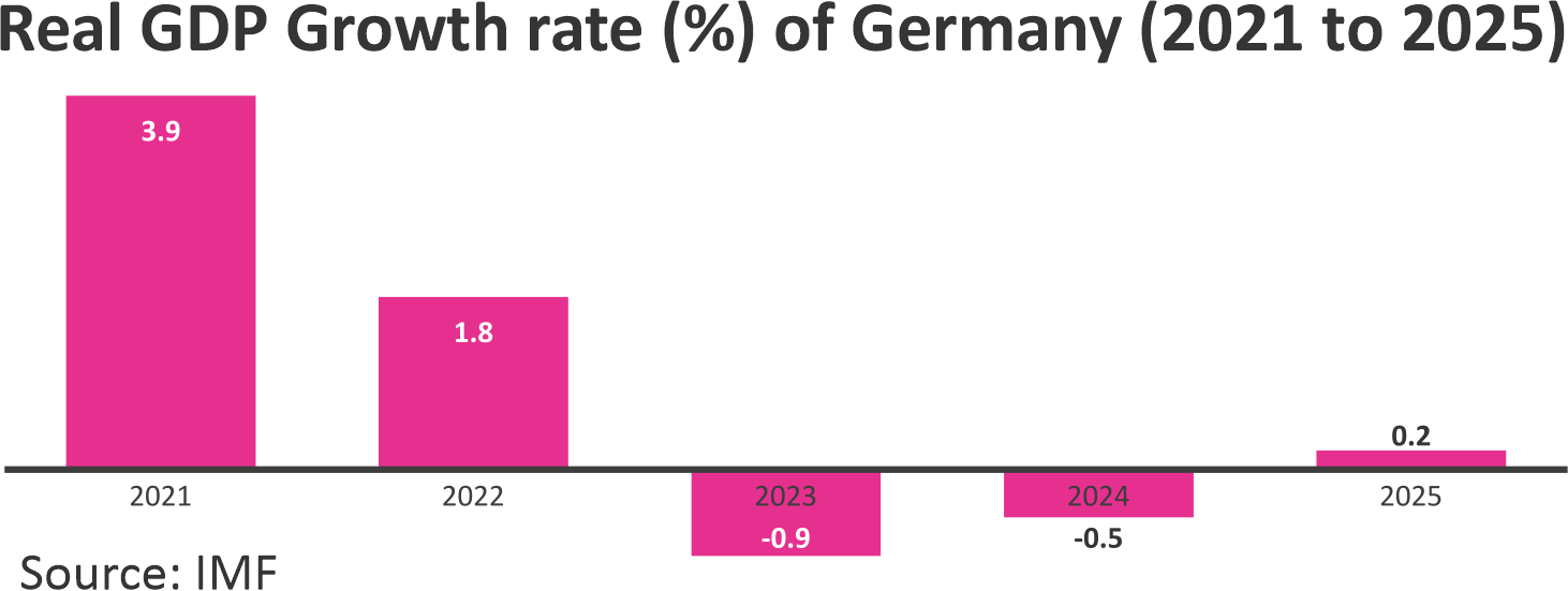 Like the rest of the world, Germany also suffered economic losses during the pandemic, revival from which was mired by geo-political tensions across the globe. As per recent updates, the country is set to recover slowly in 2024 fuelled by recovery in real household income and improved consumer sentiment. The inflationary pressure is expected to ease from 6% in 2023 to around 2.4% in 2024. Recovery in investment growth is also expected in 2025. Overall real GDP growth is forecast to increase by 0.1% in 2024 from a 0.3% decline in 2023. In 2025, real GDP growth is forecast to recover moderately to 1.0% in 2025.