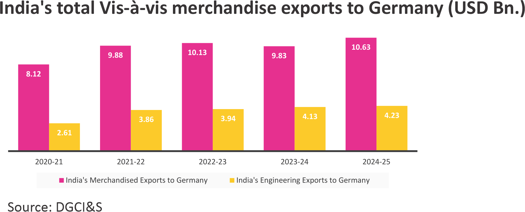 Germany is the fifth largest destination for India's engineering exports and the largest in European Union. Engineering exports to Germany was recorded at USD 3.24 billion in 2018-19 and then, after declining in the next two fiscals due to the pandemic, it continued its rise in the next fiscals. In FY 2024-25, engineering exports to Germany increased by 2.4% while India's overall merchandised exports to Germany increased by 8%.